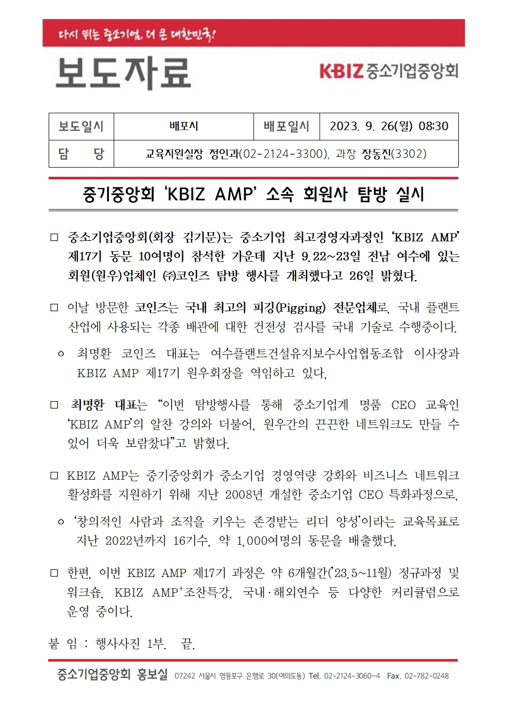 중기중앙회 'KBIZ AMP' 소속 회원사 탐방 실시