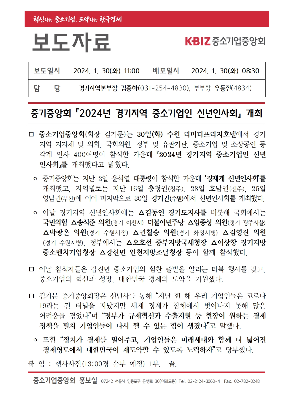 중기중앙회, 2024년 경기지역 중소기업인 신년인사회 개최