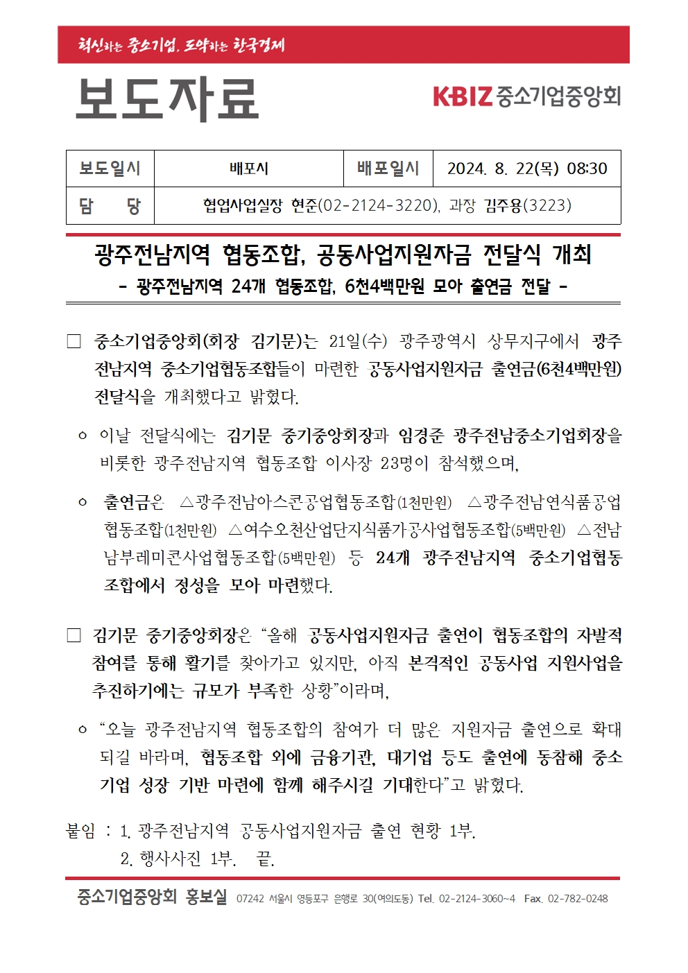 광주전남지역 협동조합, 공동사업지원자금 전달식 개최