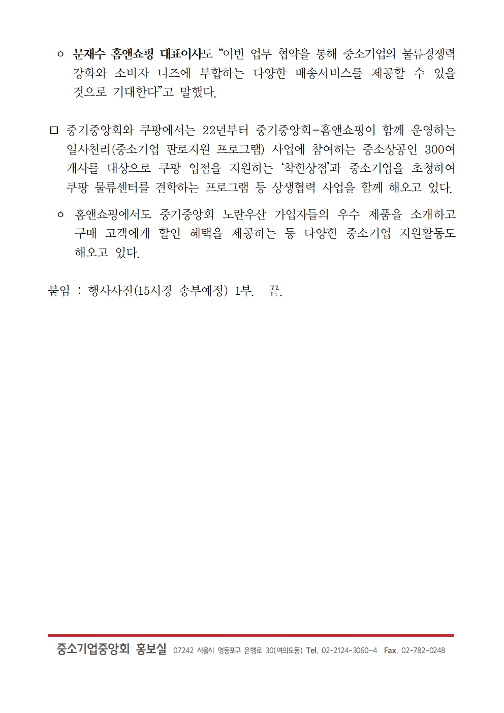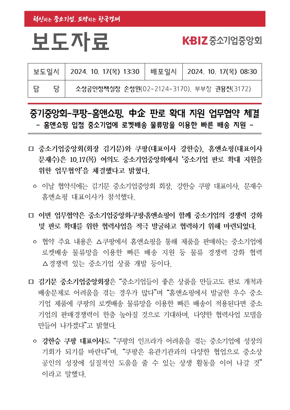 중기중앙회-쿠팡-홈앤쇼핑, 中企 판로 확대 지원 업무협약 체결