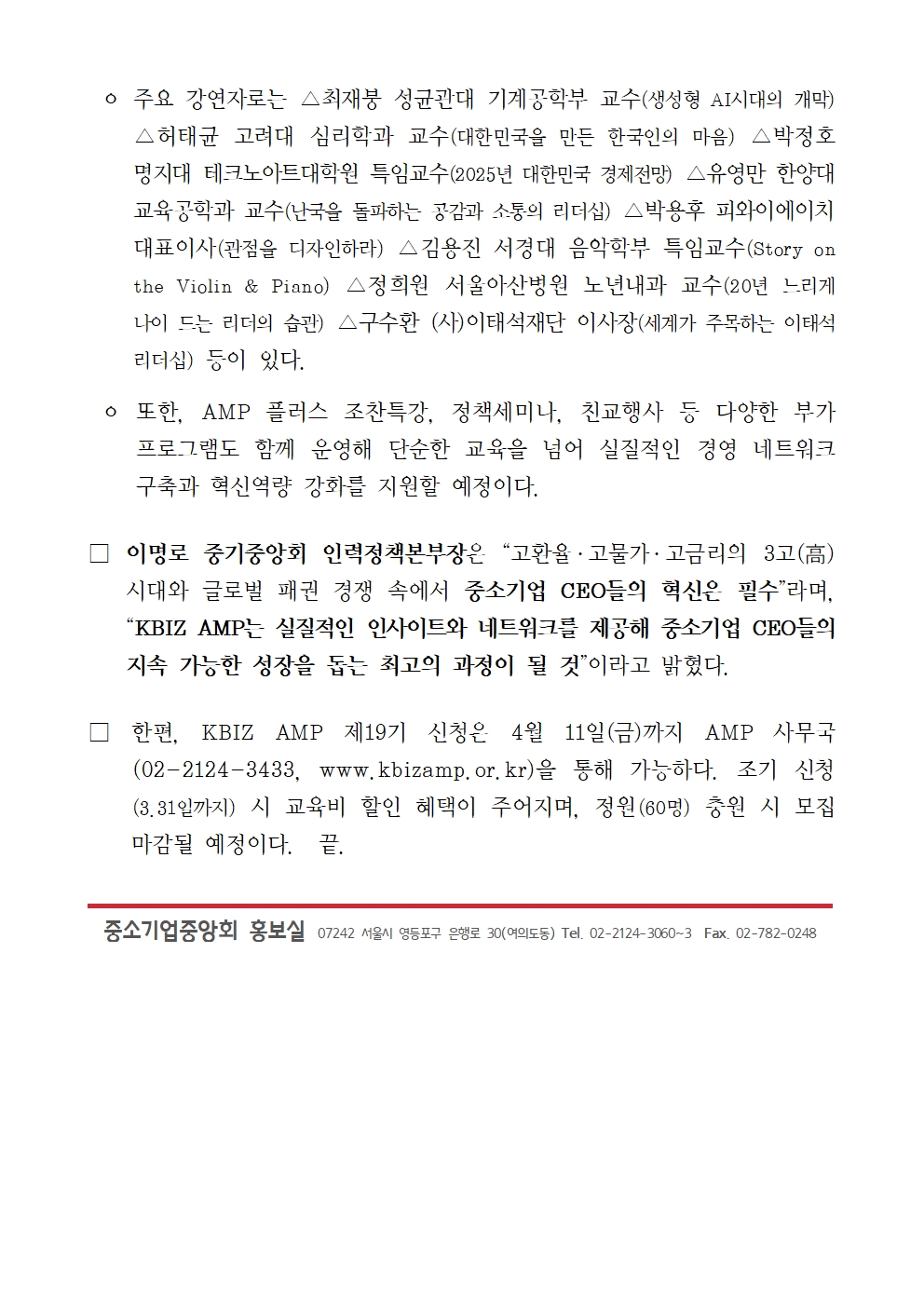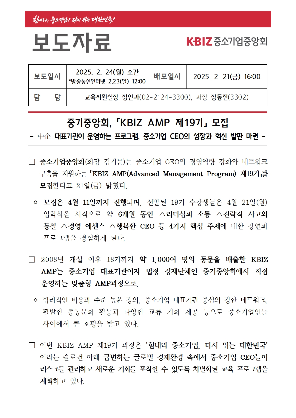 중기중앙회, 「KBIZ AMP 제19기」 모집