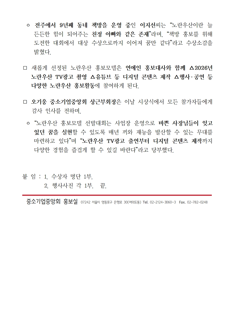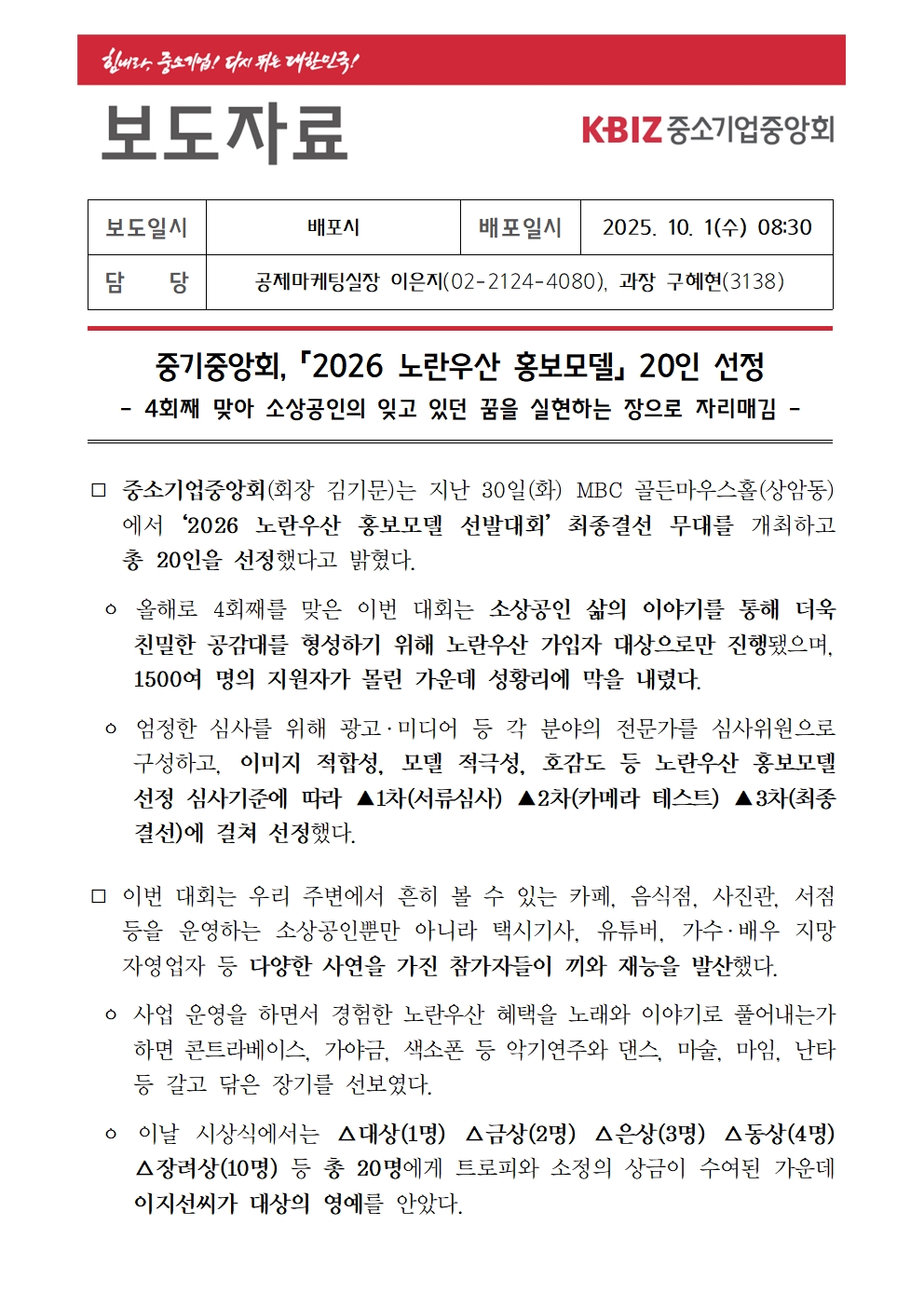 중기중앙회, 「2026 노란우산 홍보모델」 20인 선정