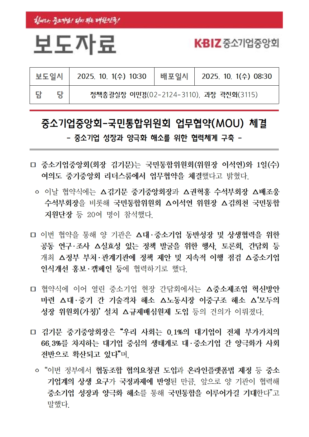 중소기업중앙회-국민통합위원회 업무협약(MOU) 체결