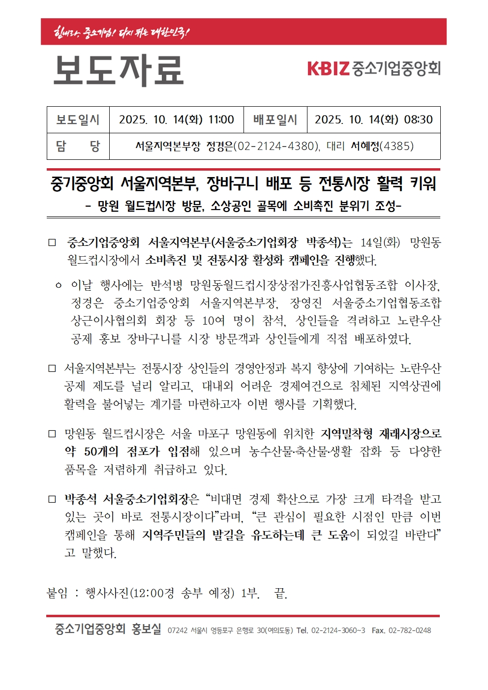 중기중앙회 서울지역본부, 장바구니 배포 등 전통시장 활력 키워