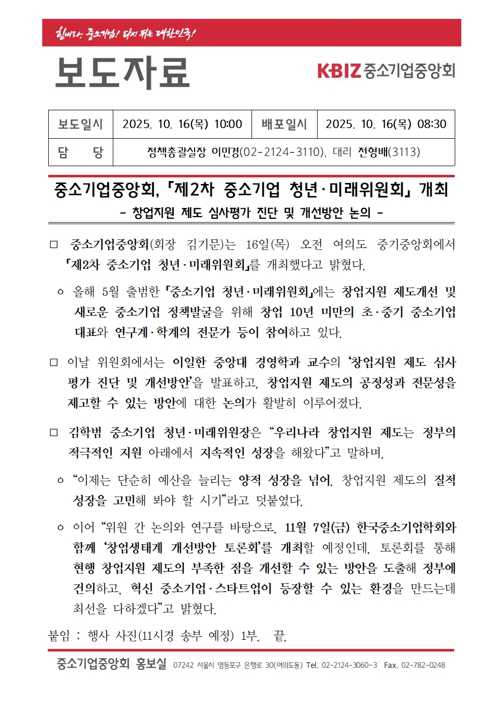 중소기업중앙회, 「제2차 중소기업 청년·미래위원회」 개최