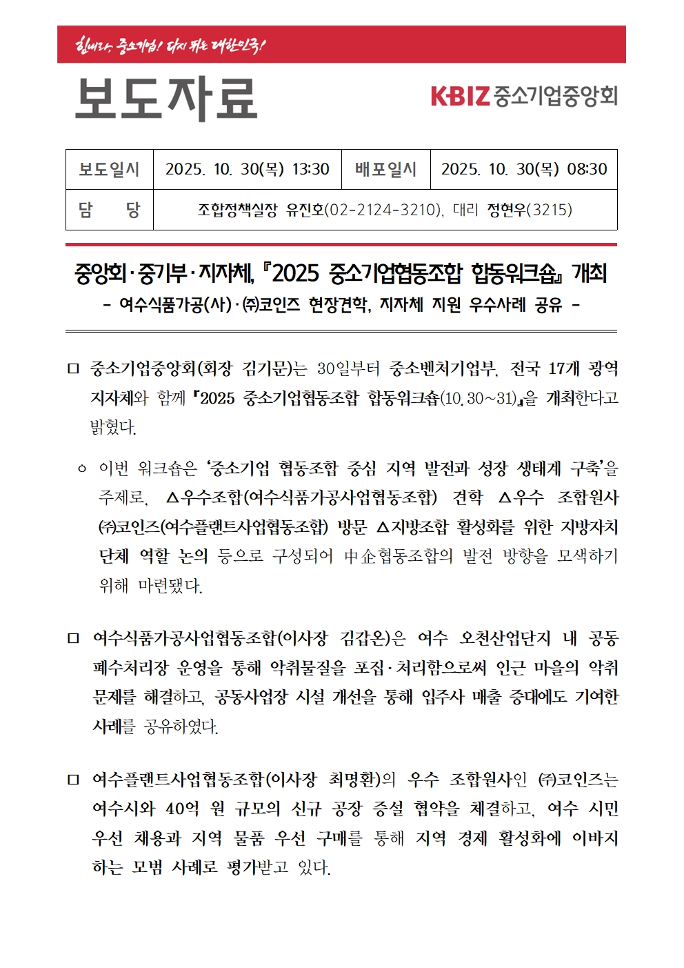 중앙회·중기부·지자체, 『2025 중소기업협동조합 합동워크숍』 개최
