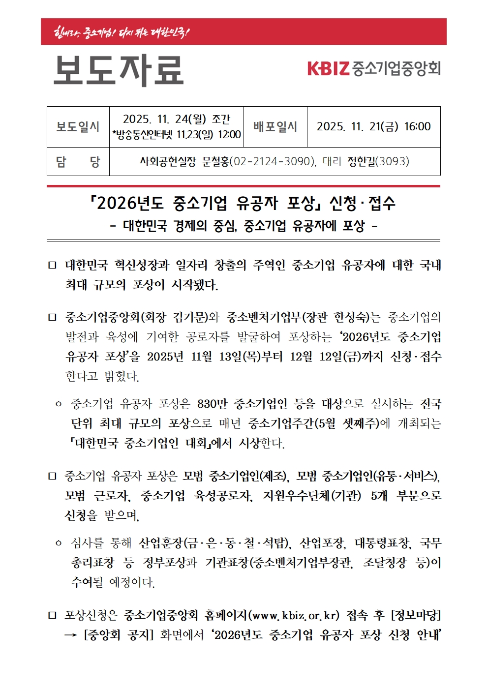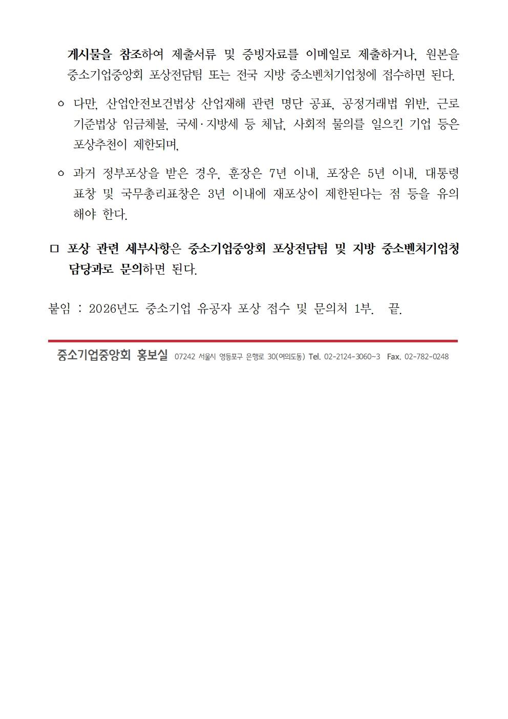 「2026년도 중소기업 유공자 포상」 신청·접수
