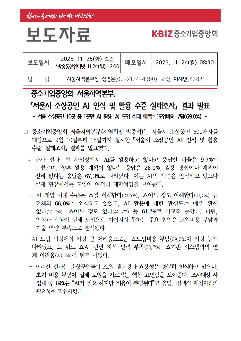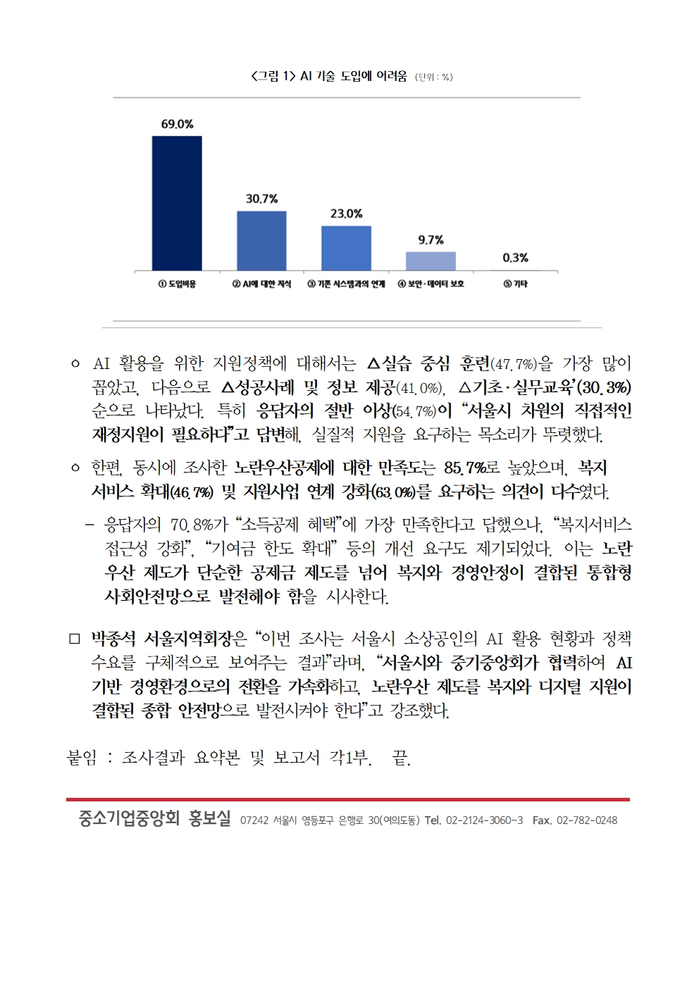 중소기업중앙회 서울지역본부, 「서울시 소상공인 AI 인식 및 활용 수준 실태조사」 결과 발표