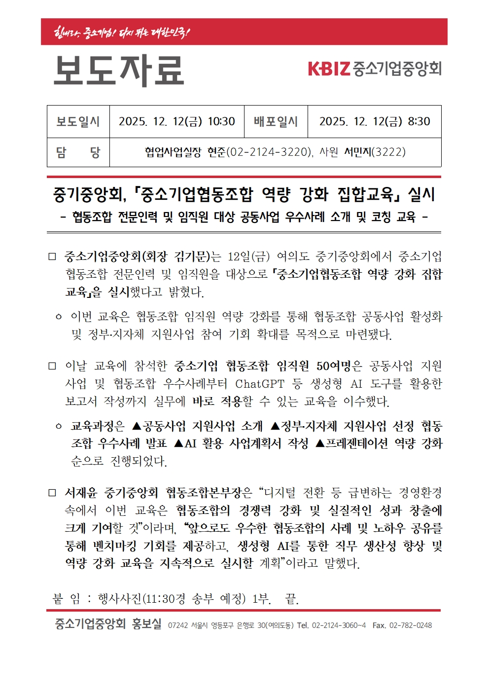 중기중앙회, 「중소기업협동조합 역량 강화 집합교육」 실시