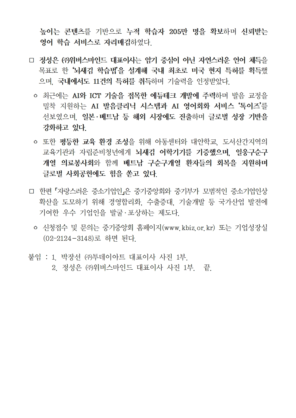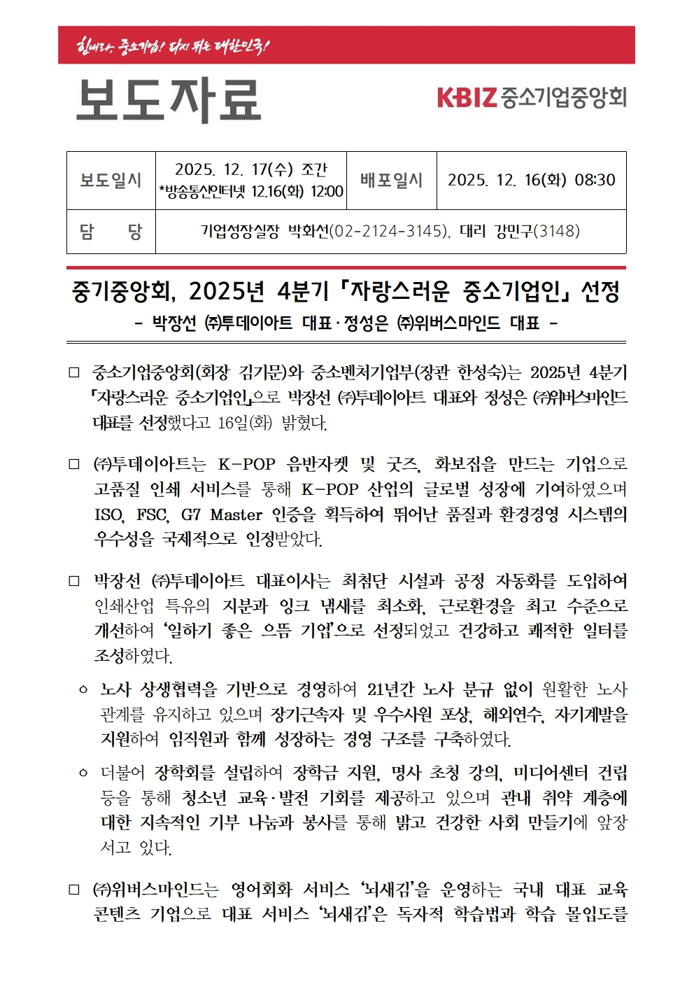 중기중앙회, 2025년 4분기 「자랑스러운 중소기업인」 선정