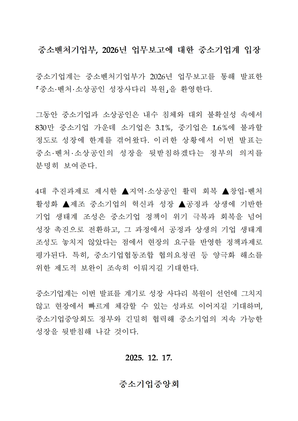 [논평] 중소벤처기업부, 2026년 업무보고에 대한 중소기업계 입장