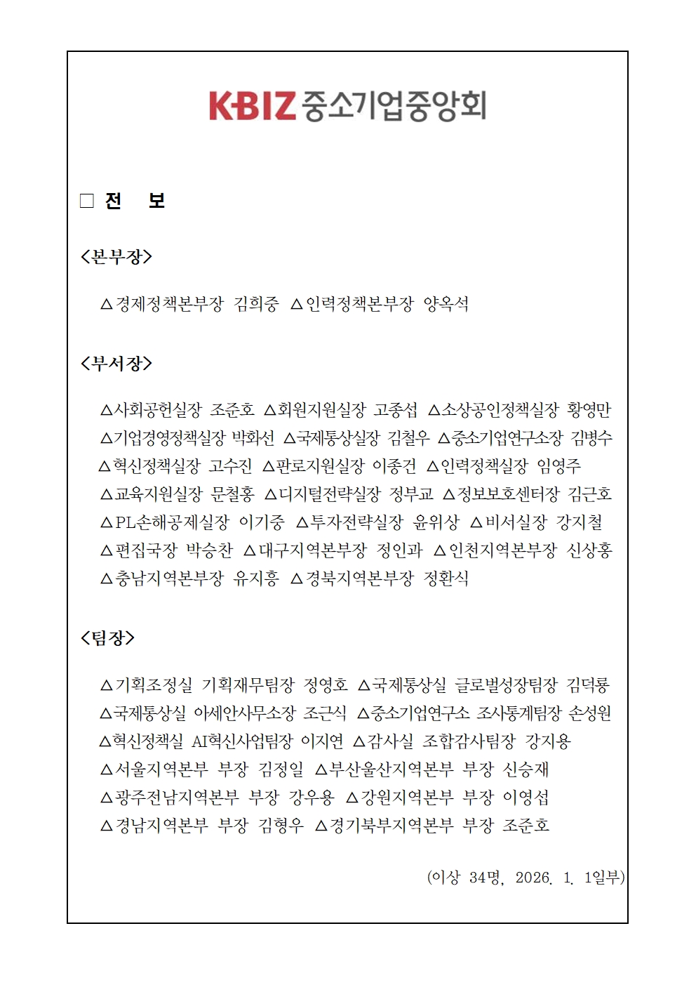 중소기업중앙회 인사(전보)