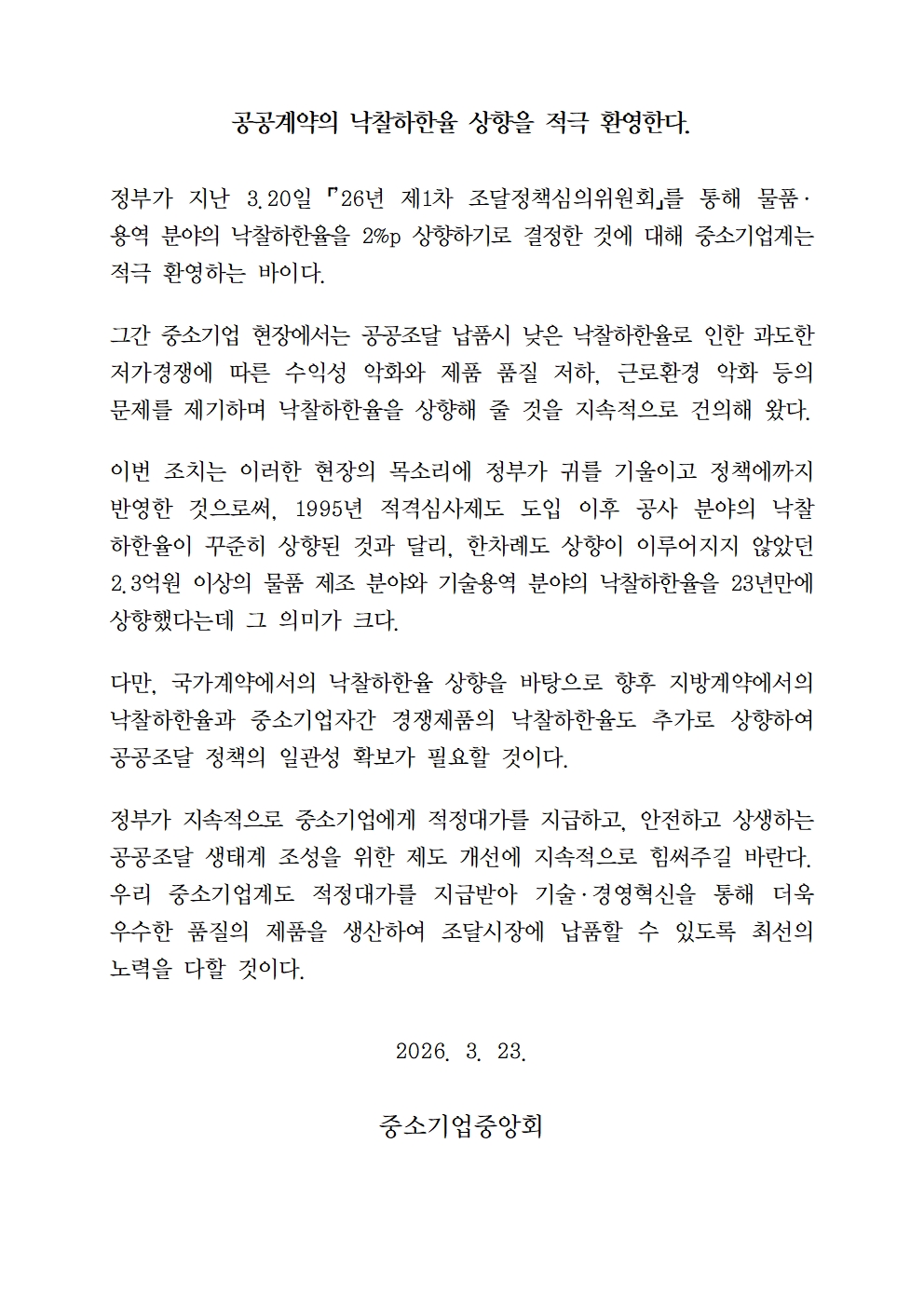 [논평] 공공계약 낙찰하한율 상향에 대한 중소기업계 입장