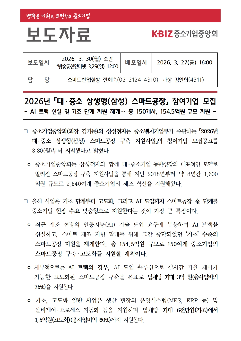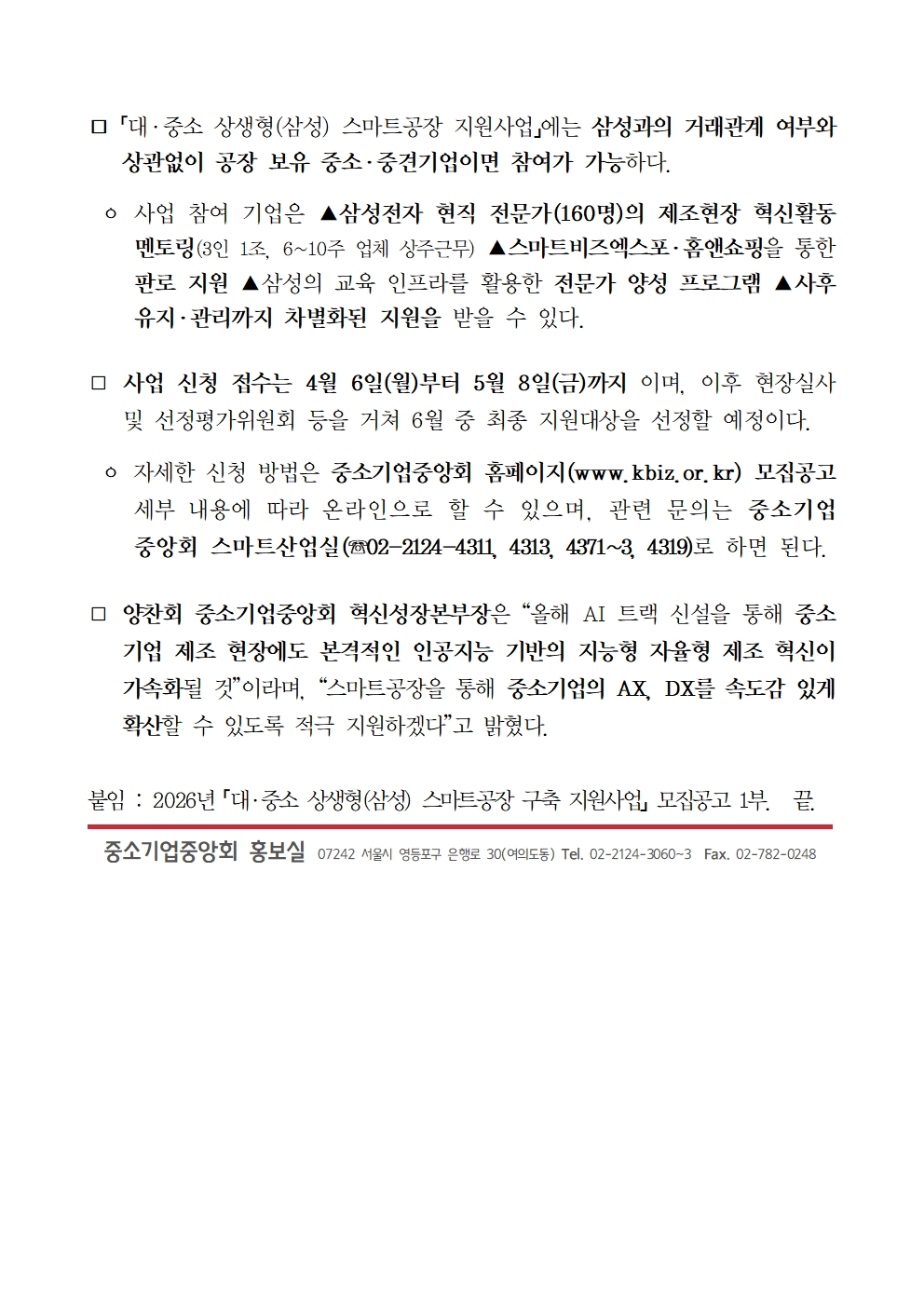 2026년 「대·중소 상생형(삼성) 스마트공장」 참여기업 모집
