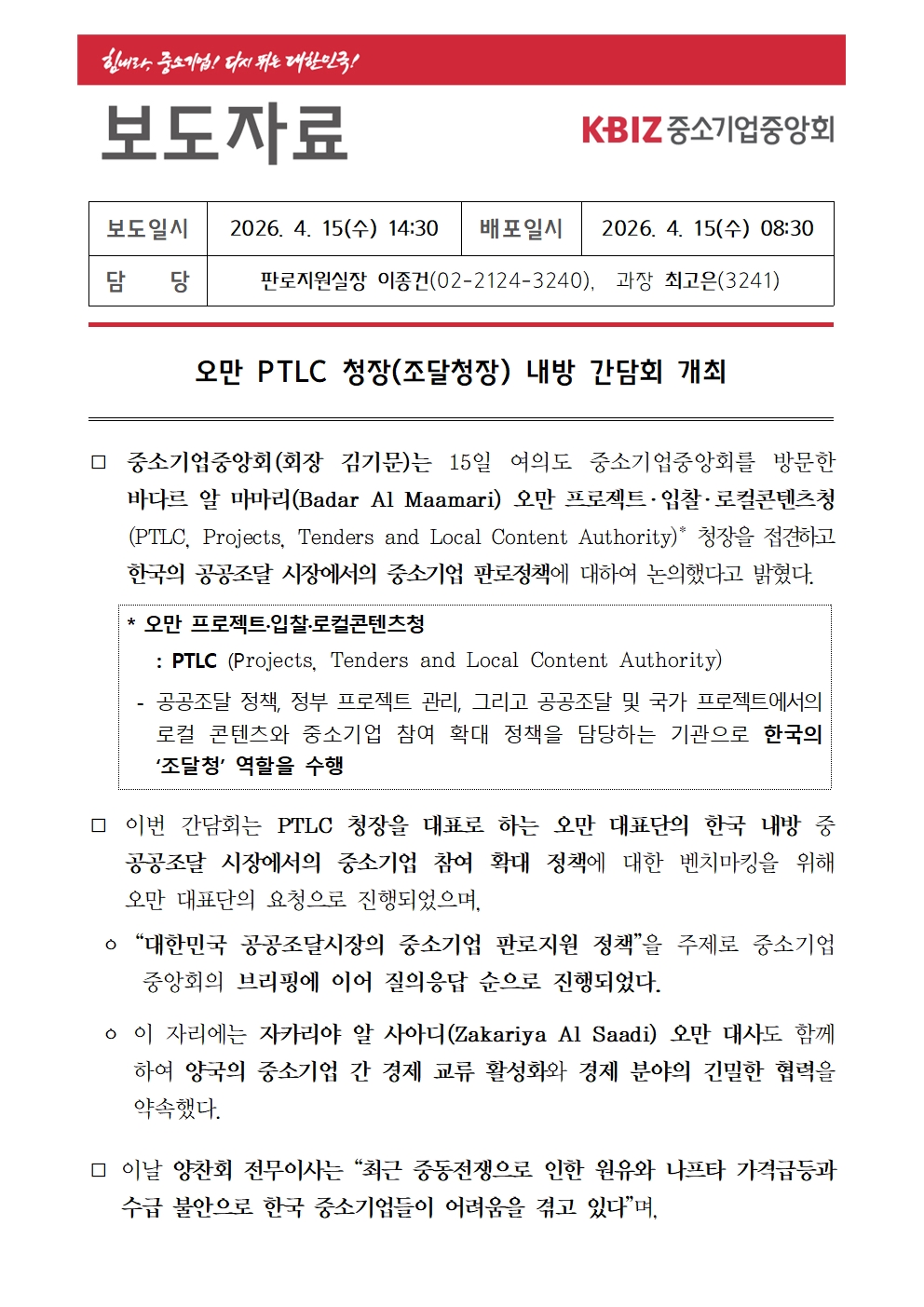 오만 PTLC 청장(조달청장) 내방 간담회 개최