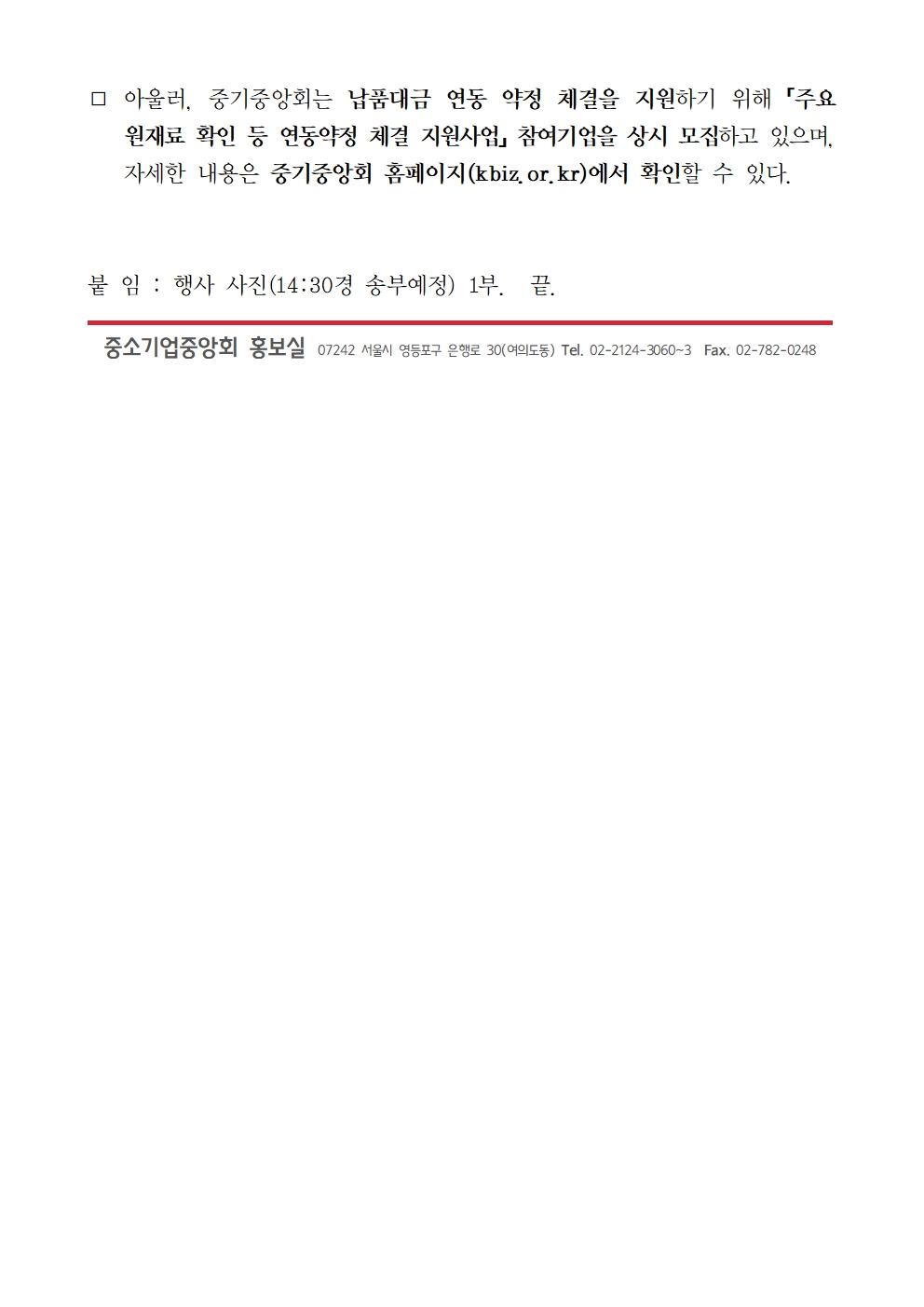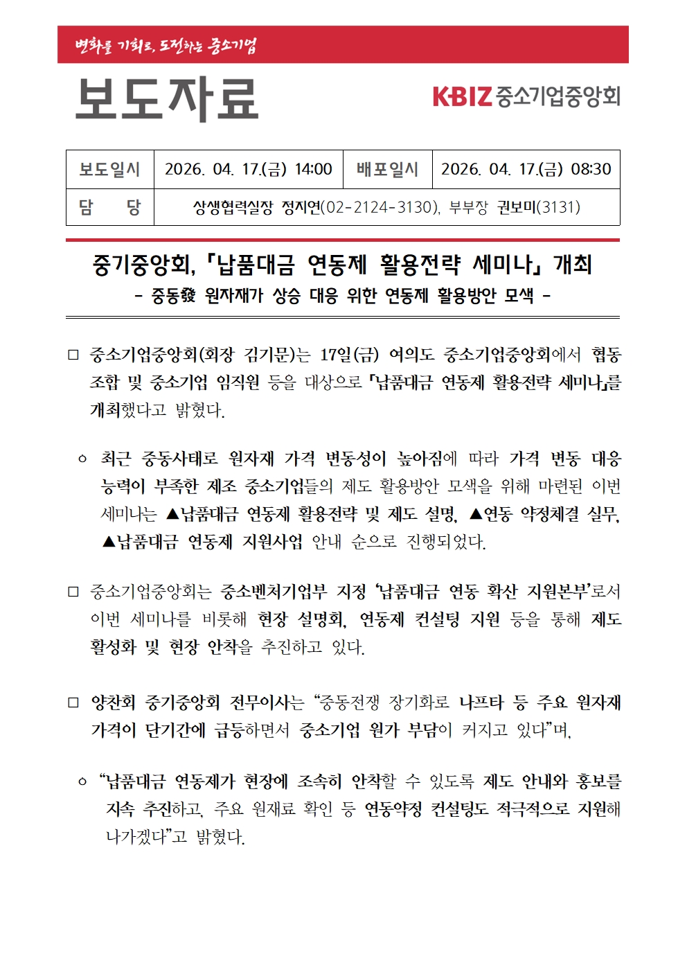 중기중앙회, 「납품대금 연동제 활용전략 세미나」 개최
