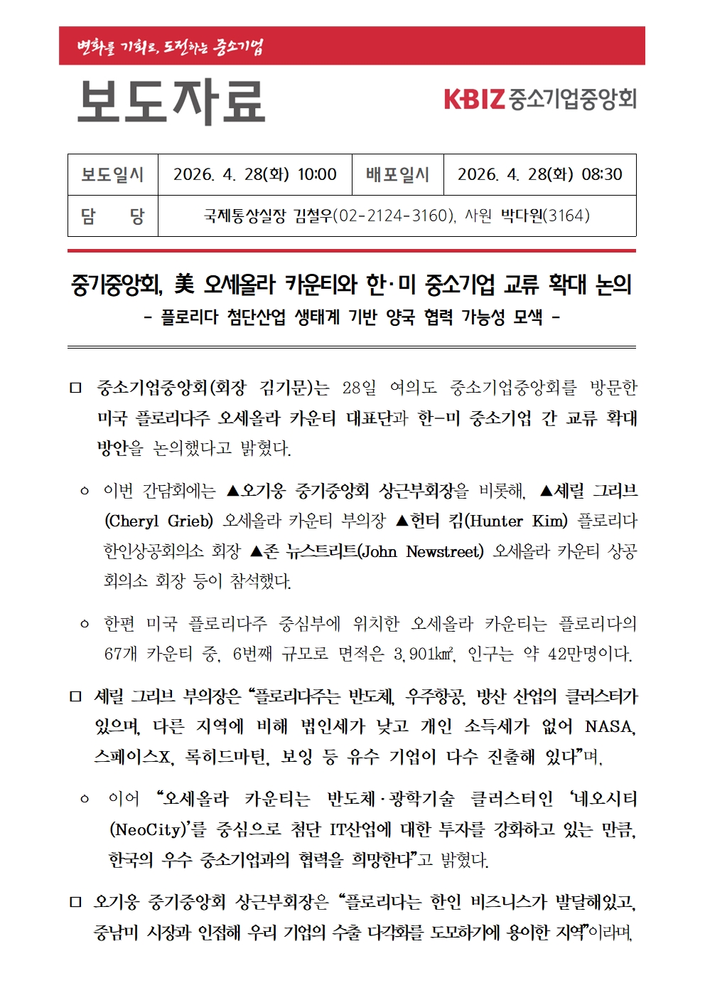 중기중앙회, 美 오세올라 카운티와 한·미 중소기업 교류 확대 논의