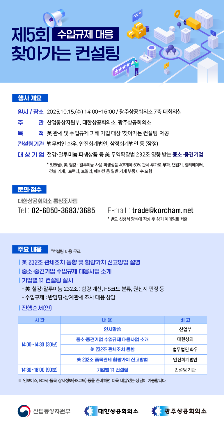 산업통상자원부와 대한상공회의소는 제 5회 찾아가는 수입규제 대응 컨설팅을 광주에서 개최합니다.