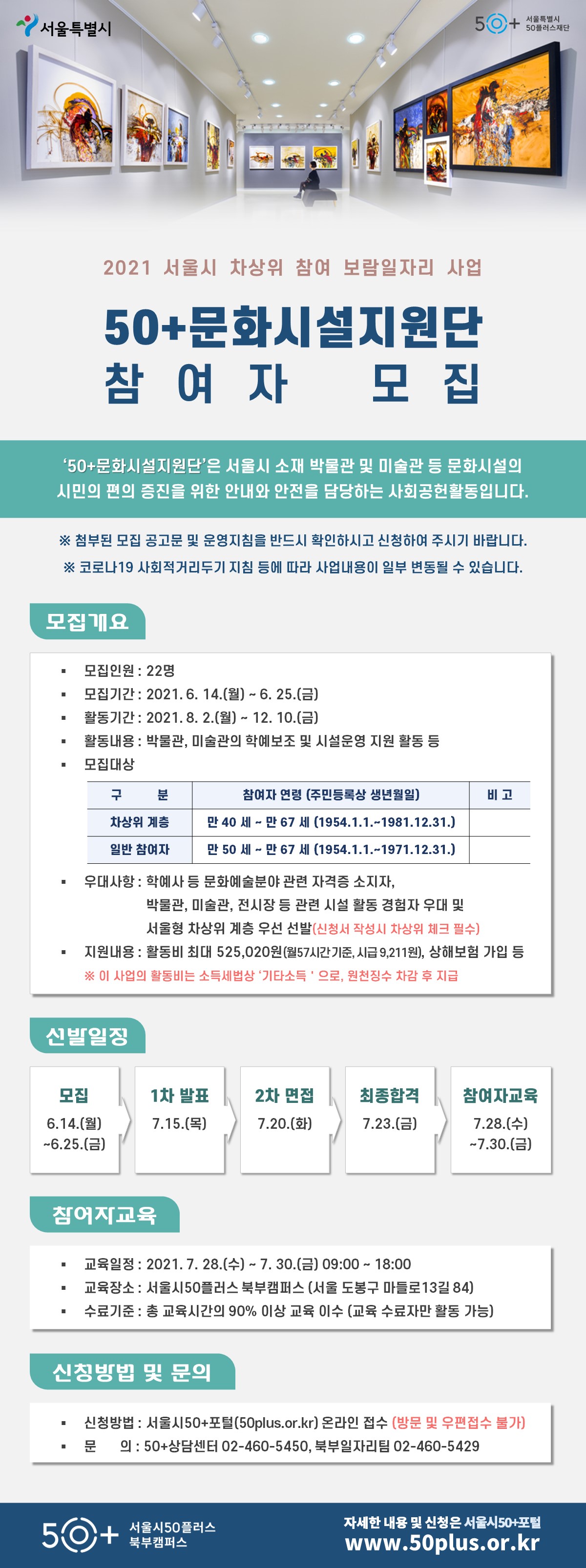 2021 서울시 차상위 참여 보람일자리 『50+문화시설지원단』은 서울시 소재 박물관, 미술관 등 문화시설을 이용하는 시민 편의 증진을 위한 안내와 안전을 담당하는 사회공헌활동입니다.