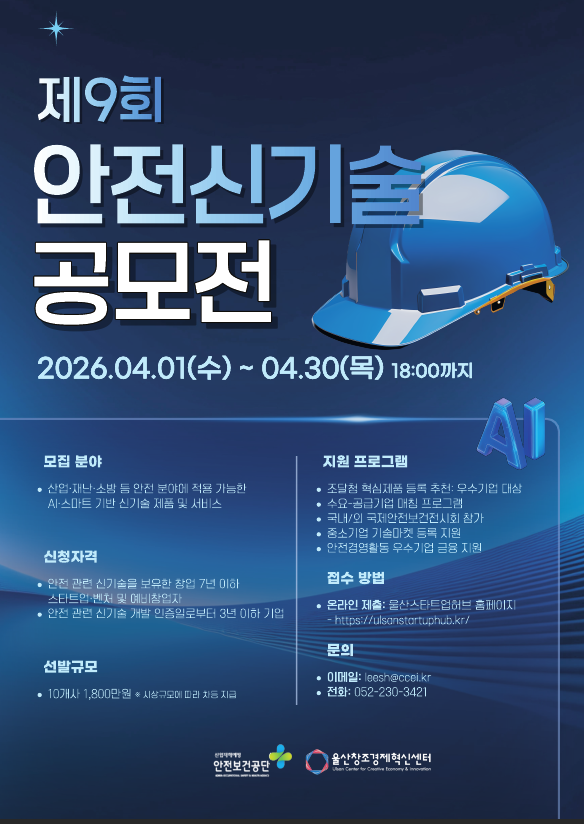 ㅇ (재)울산창조경제혁신센터는 산업안전보건공단과 함께 산업·재난·소방 등 안전 분야에 적용 가능한 AI·스마트 기반 신기술 제품 및 서비스를 보유한 (예비)창업자 및 벤처·중소기업을 발굴 및 육성하기 위해 「2026 제9회 안전신기술공모전」을 추진하고 있습니다.
