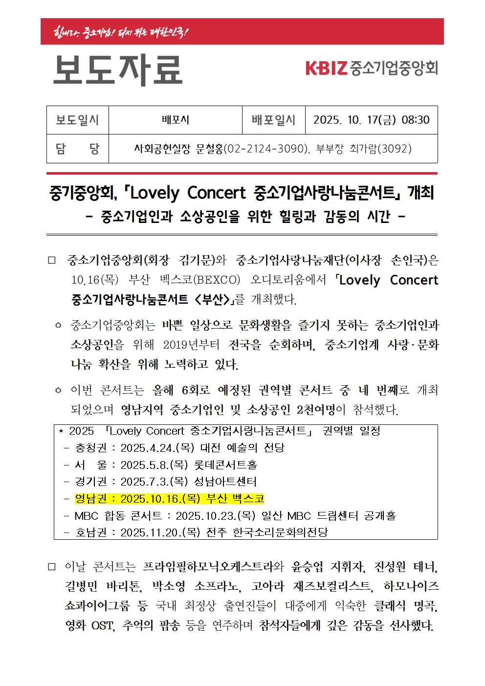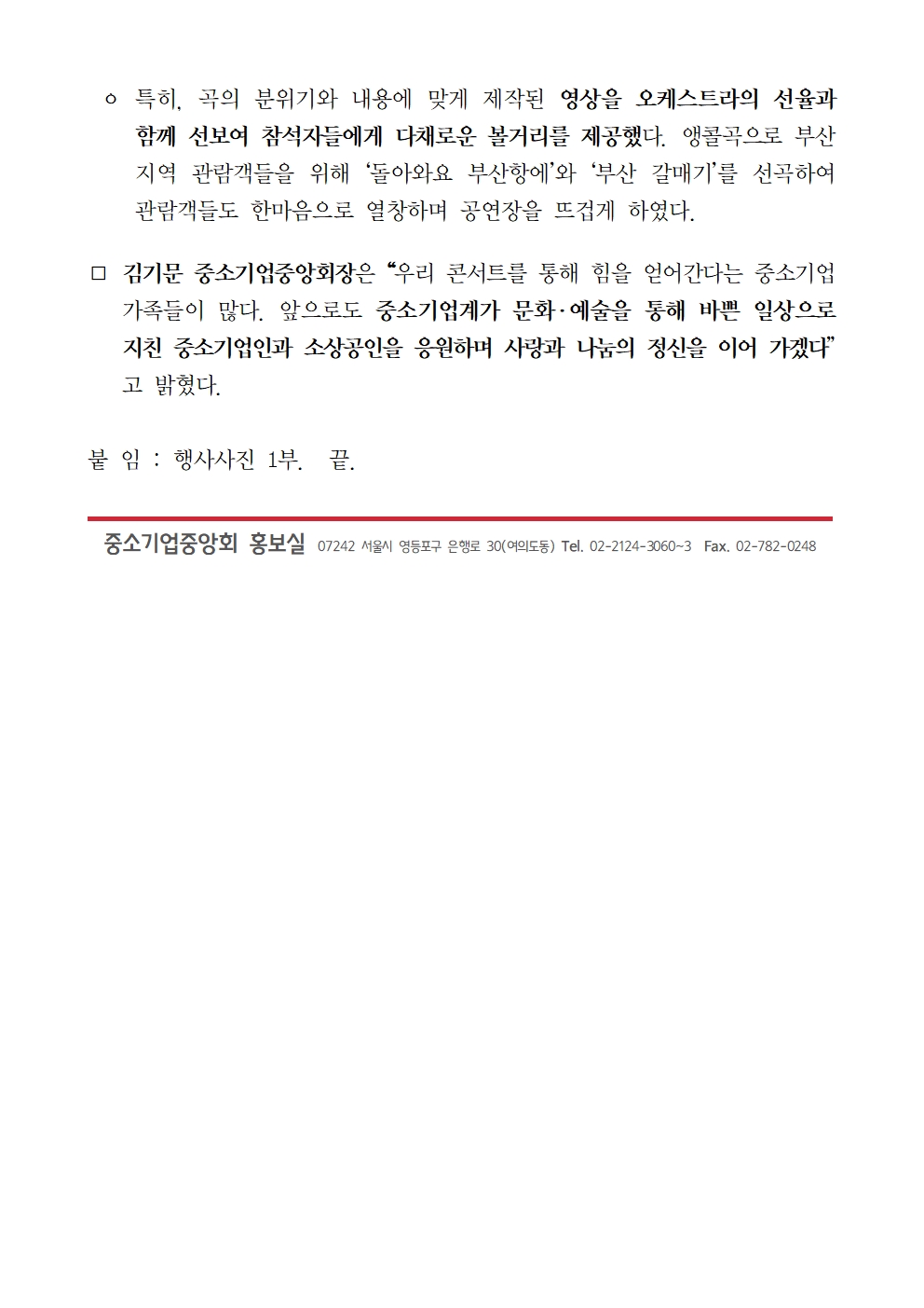 중기중앙회, 「Lovely Concert 중소기업사랑나눔콘서트」 개최
