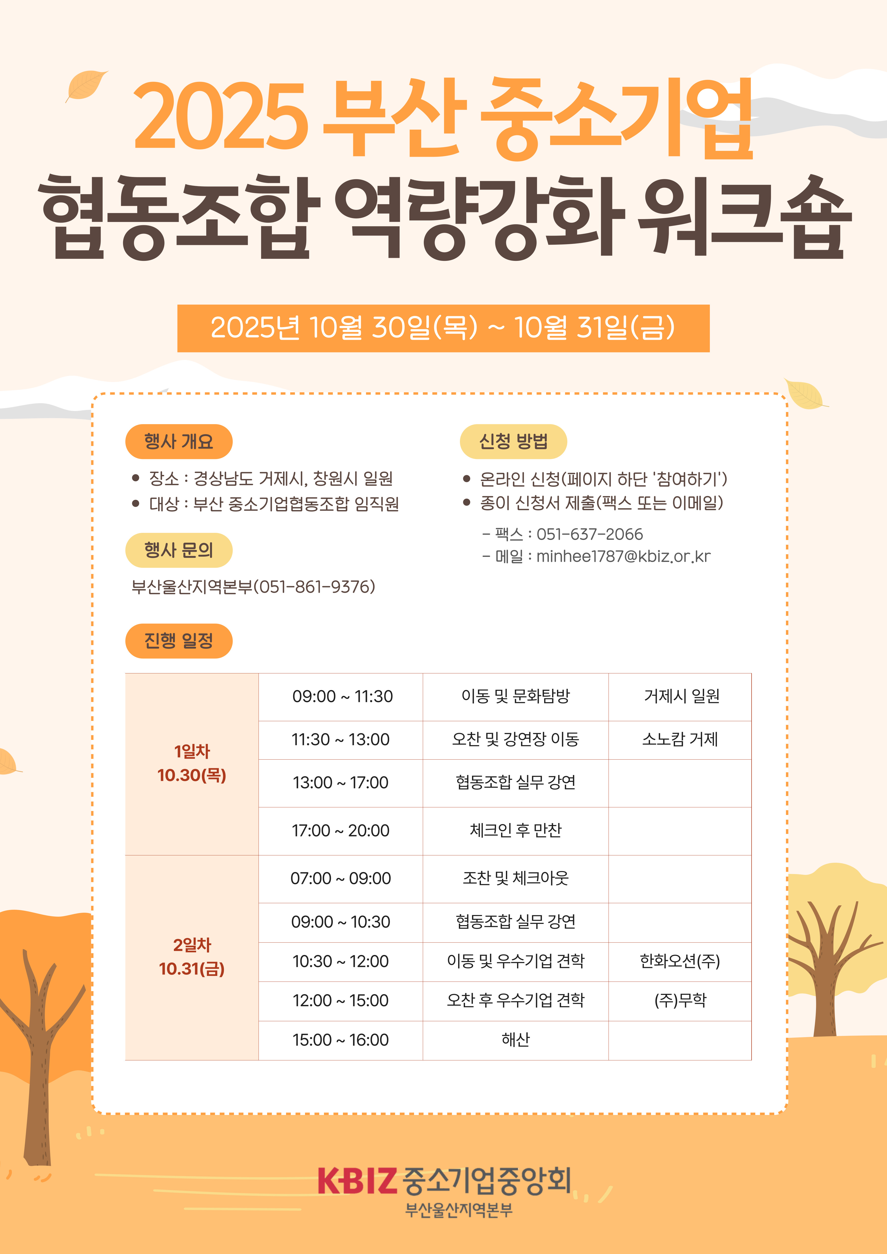 ㅇ 본회에서는 협동조합 환경변화에 따른 역량 강화 및 조합 간 정보교류 등을 위해 '2025 부산 중소기업협동조합 역량강화 워크숍'을 개최하오니 많은 참가 바랍니다. ㅇ 참가 신청 : 홈페이지 하단 '참여하기' 버튼 클릭 후 참가자 정보 입력