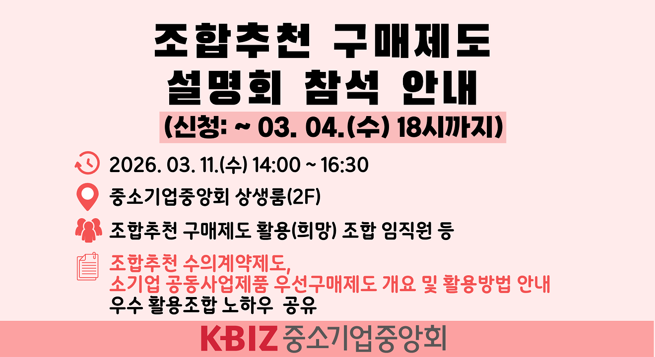 ㅇ주요내용 : 조합추천 수의계약제도 및 소기업 공동사업제품 우선구매제도 개요 및 활용방법 안내, 우수 활용조합 노하우 등 공유