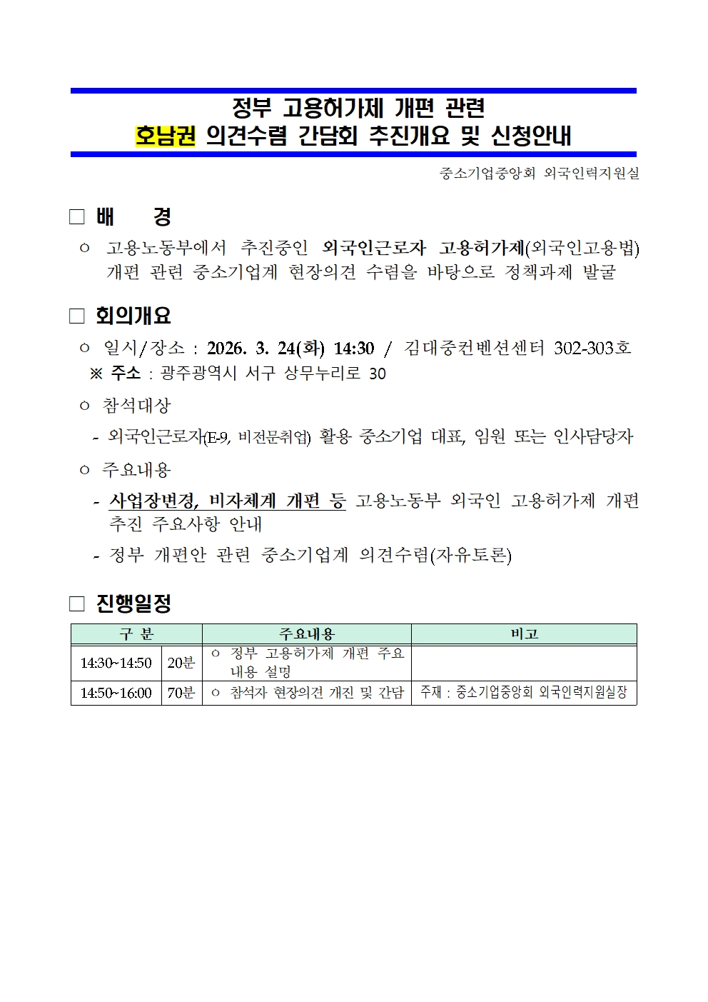 정부 외국인 고용허가제 개편 관련 광주 권역 의견수렴 간담회를 개최하오니 많은 참석 바랍니다.