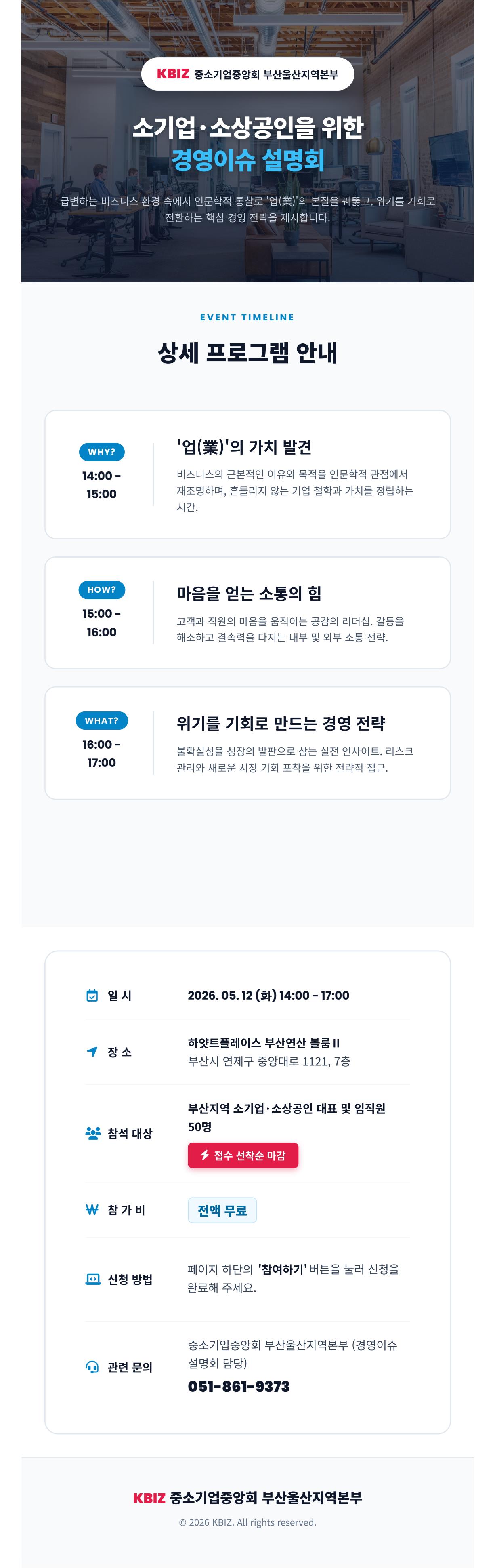 ㅇ 중소기업중앙회 부산울산지역본부에서는 소기업·소상공인의 지속가능한 핵심역량 강화를 위해「2026 부산지역 소기업·소상공인 경영이슈 설명회」를 아래와 같이 개최합니다.
