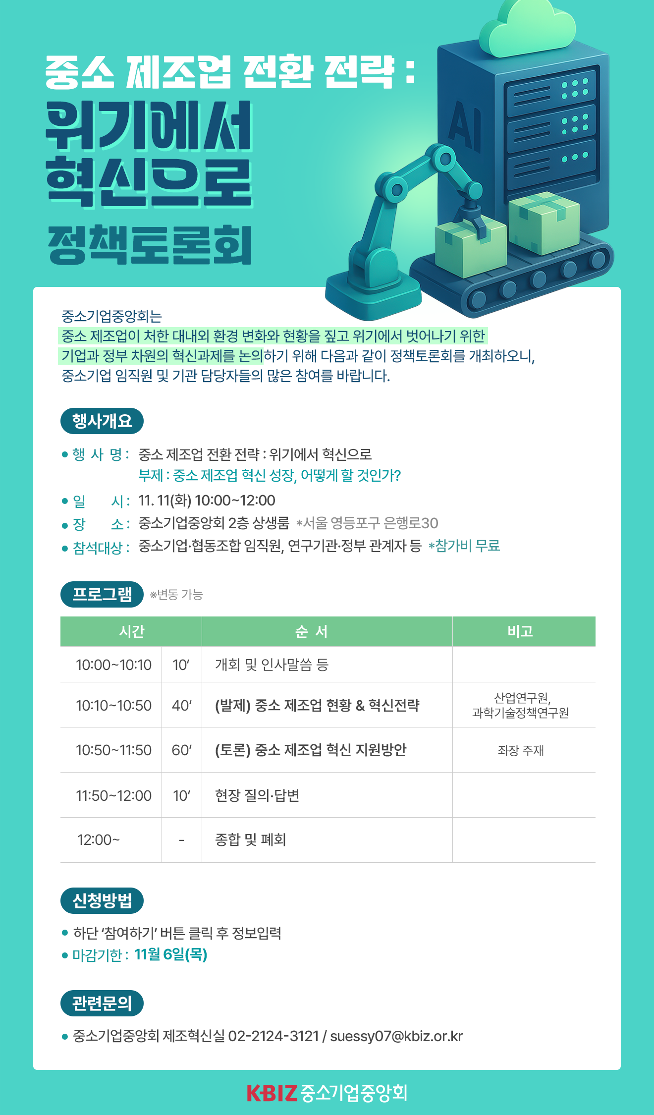 「중소 제조업 전환 전략 : 위기에서 혁신으로」 정책토론회 참가 신청 참여하기 ▼