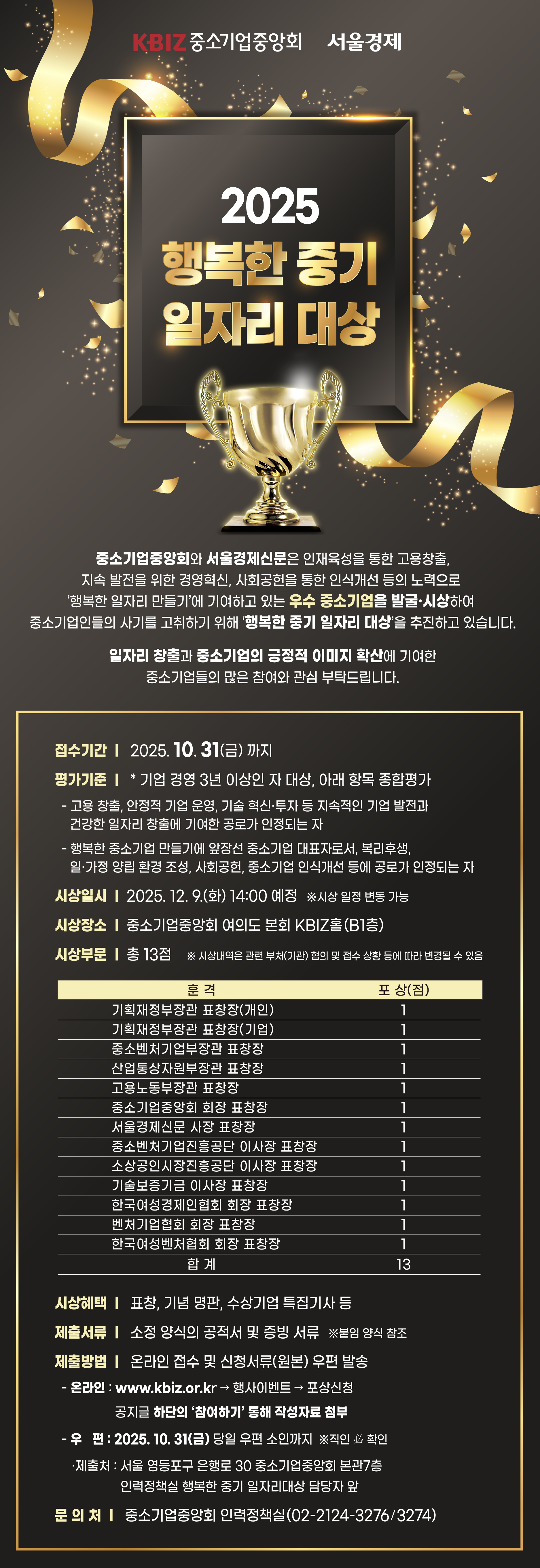 - (주소) 서울 영등포구 은행로 30 중소기업중앙회 본관 7층 인력정책실 '행복한 중기 일자리대상’ 담당자